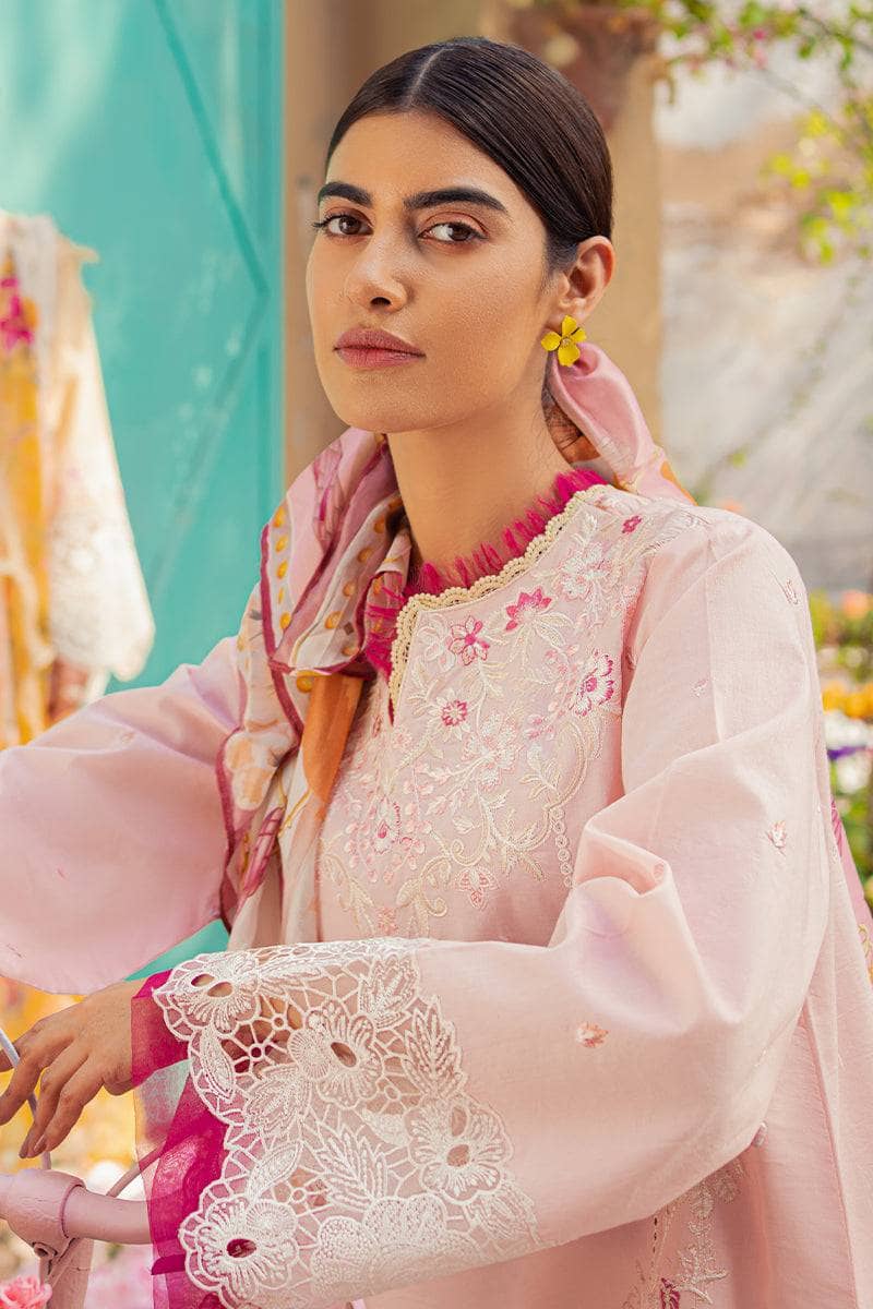 Lara: "Sweet and sophisticated, this baby pink Chikan embroidered shirt with crochet lace details and handmade tassels is paired perfectly with a digital print silk dupatta and dyed cotton trouser for a feminine and elegant summer look."
