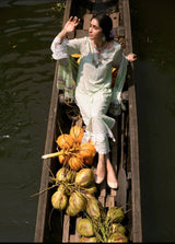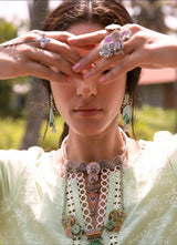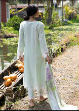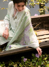 Pichak, inspired by the tropical ivy, a dull pistachio coloured outfit designed with master techniques to depict utmost elegance. Dense spread of floral motifs and leafy network embroidered using pearl white thread amalgamated with Broderie anglaise and eyelet embroidery to finish off the shirt. In-built white floral guipure lace inserts for the shirt and sleeves for a look to resonate with the summer garden. Comes with a mint green trouser and pure silk digital printed dupatta with lavender and moss green flowers. Our fashion advice would be to get a long shirt with straight pants stitched and wear it with silver accessories to a summer evening look.