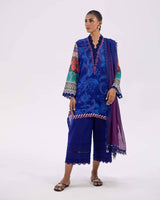 Make a statement with this wonderful ensemble in royal and Egyptian blue with berry tones, enhanced with multi-colored chatapati printed sleeves. Coupled with matching pants and a dazzling dupatta.