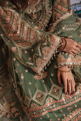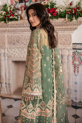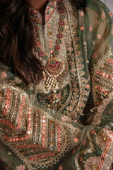 Syra Yousuf is muted sage green kameez pajama ensemble defines elegance and modern restraint. The shirt is accented with carnation pink floral motifs and decorative lozanges enclosed in panelled lattice that elongates the silhouettes giving you options to stitch kameez in different lengths. It is paired with coordinating pajama and embroidered dupatta that features sweeping scrolls of floral garlands.