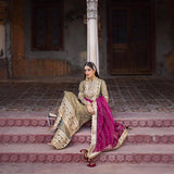 Behold the 'Nawab Sahiba' ensemble, a regal masterpiece for the modern bride. This opulent creation is adorned with Tilla karandi stripes, meticulously embroidered and embellished with twin sequins, mirrorwork, and intricate Tilla work throughout the shirt. The ensemble is elevated by the addition of an organza dupatta featuring sequin strips and a sumptuous four-sided border, perfectly complementing the luxurious aesthetic.The elegance continues with the embroidered trouser, complete with borders of exquisite embellishments. 'Nawab Sahiba' is a testament to timeless grandeur and refined taste, making it the quintessential choice for brides who desire the utmost in sophistication and opulence.