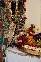Sajal wears Basgul, a stunning soot colored ensemble featuring cascading floral vines and motifs composed between carefully placed arches. The kameez is generously hand embellished with accents of gota, dabka, hand cut sequins and pearls. Paired with an embroidered Dhaka pajama finished off with embroidered chatta patti borders. The laser cut dupatta is a work of art with carefully placed motifs and chatta patti in complimenting tones of baby pinks and blues.