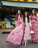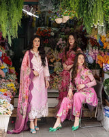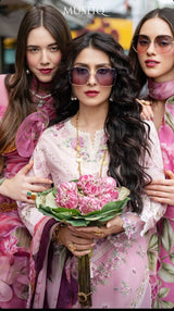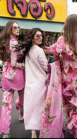 An article inspired by the rich and regal Thai heritage, WALIA enfolds a mesmerizing tale of artistic details on a pink canvas. The floral embroidered neckline front creates a satisfying and symmetrical look that is pleasing on the eye. The neckline is further incorporated with shimmering tassels. The laser cut daman pays a perfect homage to the beautiful culture that this campaign is based upon. The dark pink chiffon dupatta completed this divine ensemble.