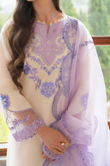 Embrace your inner DIVA with this urbane beige ensemble. The cotton shirt features blue and purple floral eyelets and embroidery that are fit for a queen. The lilac organza net dupatta with a laser-cut blue and purple border is the perfect complement to the stunning shirt and trouser combo.