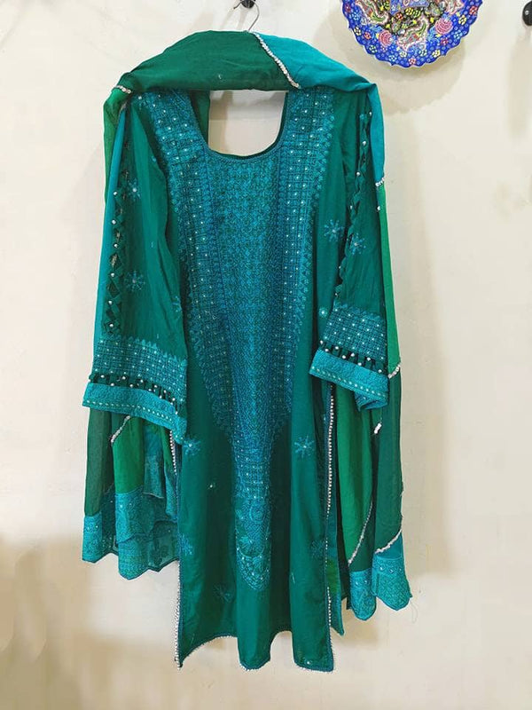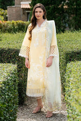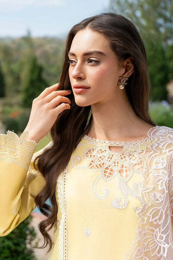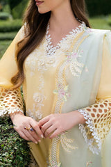 Embrace the warmth of the SUMMER SUN with this beautiful light-yellow ensemble. Adorned with delicate hand-embroidered 3D flowers, the shirt and trouser set is the perfect combination of elegance and comfort. Complete the look with a contrasting organza dupatta featuring scalloped embroidered details and let your style bloom like the flowers on your shirt.