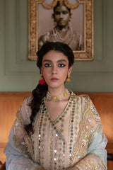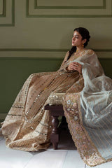Aaima, a masterpiece of unparalleled beauty, is an outfit that seamlessly weaves together glamour and tradition. This captivating ensemble in beige features an embroidered sequin and hand-embellished neckline on delicate organza net, exuding opulence and timeless elegance. The extraordinary attire has an intricately designed neckline. Each sequin and embellishment has been carefully placed, creating a dazzling display of artistry and finesse.