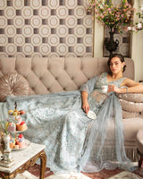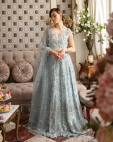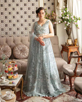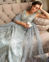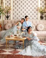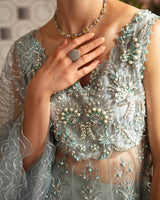 This ethereal design on a dusty aqua canvas sets high standards for unstitched luxury formals this season. Intricately embroidered and generously hand-worked, the bodice is further elevated with a spray of aqua seed pearls all over the panels of this stunning peshwaas. A sequined spiral net dupata adds an extra oomph to SABINE. Perfect for afternoon weddings in the coming season, this design is surely going to be a stellar.