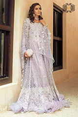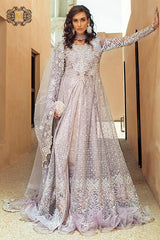 A fairy tale lilac ash tulle shirt is heavily embroidered in geometric patterns on the front and back with sequins and pani. Bordered with a dense border embroidered in shades of candle pink and lilac with sequins, pani, and silver tilla. Pearls, 3D flowers, naqshi, and stones grace the neckline of this design along with beautifully composed tulle sleeves. This design comes with a rich dyed jamawar lehnga in lilac along with a pani embroidered tulle dupatta with a spray of pearls on the borders. Stitched either as a floor length open shirt or a pishwaas, this will surely make you a headturner.