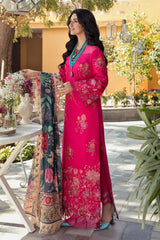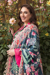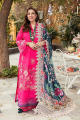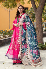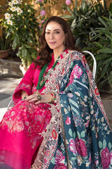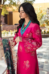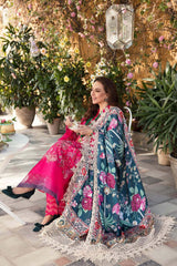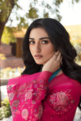 Alyana by Nilofer Shahid is the perfect choice for a sophisticated Chic look. This gorgeous fuchsia dress is adorned with vintage European motifs and features a deep teal printed Dupatta with an exotic floral foliage. The timeless design and intricate detailing truly creates a marvelous spell bounding Aura.
