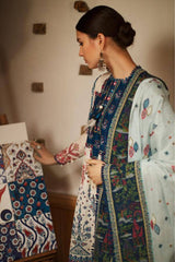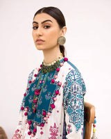 Gorgeous tribal embroideries are rendered in shades of shocking pink, teal, navy blue and feroze silk thread on a cream striped canvas in 'Melike.' Accompanied by deep teal panels with beautifully composed embroideries, neckline patches and two additional borders, this design truly packs a punch. Layered with a pure swiss voile dupatta in a sky blue, with an all over booti spray and a gorgeous shikargah border for all 4 sides, this design will make a striking statement no matter your surroundings.
