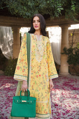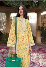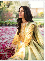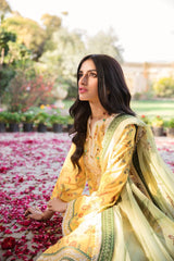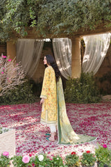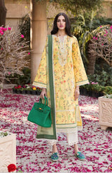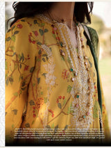 AILEEN: This Chinoiseries inspired print in summer yellow color on lawn fabric brings vibrance and balance as it is beautifully drawn with a lot of attention to its detail. Put together with ivory thread embroidered neckline, front layout right left shirt patches and twin hem front and back embroidered borders, one of them consisting of eyelet technique. This 3piece design is collaborated with contrasting sage green chiffon printed dupatta that creates an aura of happiness and relaxation while surrounding us with nature’s gift like shinning bright sun, little birds and floral whiffs. It is paired with dyed cream cambric trouser.