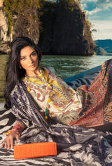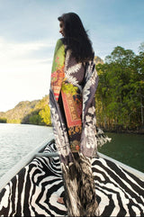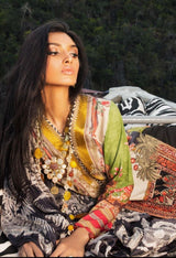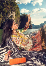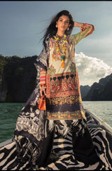 A black and beige digitally printed lawn shirt inspired by jewelry and paisleys with Ottoman inspired multicolored embroidery on the neckline and daman. Paired with a digitally printed floral lace design monochrome silk dupatta and black dyed cotton pants.