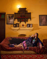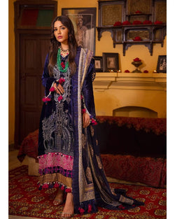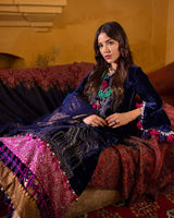 Experience the world of ultimate grandeur in this deep blue ensemble with silver zari and resham sequence in ethnic style with a traditional banarsi border. Paired with pants and a tulle net dupatta that is finished with a gold paste printed banarsi style.