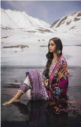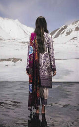 Look spectacular in this purple and cream ensemble with exquisite floral motifs on the neckline. Paired with a bold floral rotary printed khaddar dupatta in contrasting colors of magenta, yellow, orange, green, and sky blue.