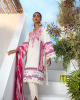 Dreaming about ethnic prints and appeasing colours? This ensemble is surely for you. This jasmine white lawn base beckons with pearl blush, French rose, cerise and magenta flora and Mughal motifs, featuring a border with Pashmina sozni shawl and floral prints in the same colour palette. Paired with simple and comfortable jasmine white cotton pants and a beautiful silver chiffon dupatta, layered with printed gradient stripes in hues of pearl blush, French rose, cerise, magenta and jasmine whites.