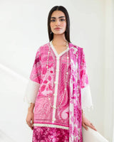 Beautifully crafted from a glamourous shade of taffy pink and rose, this printed lawn shirt is adorned with embroidered laces and exquisite details. Paired with a printed chiffon dupatta with chintz flowers and cream pants, echoing a hum of lush garden.