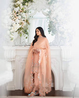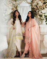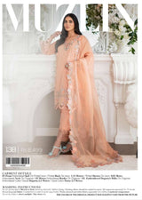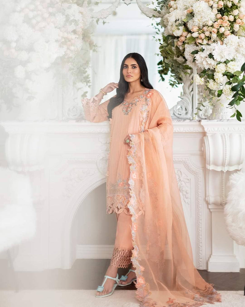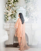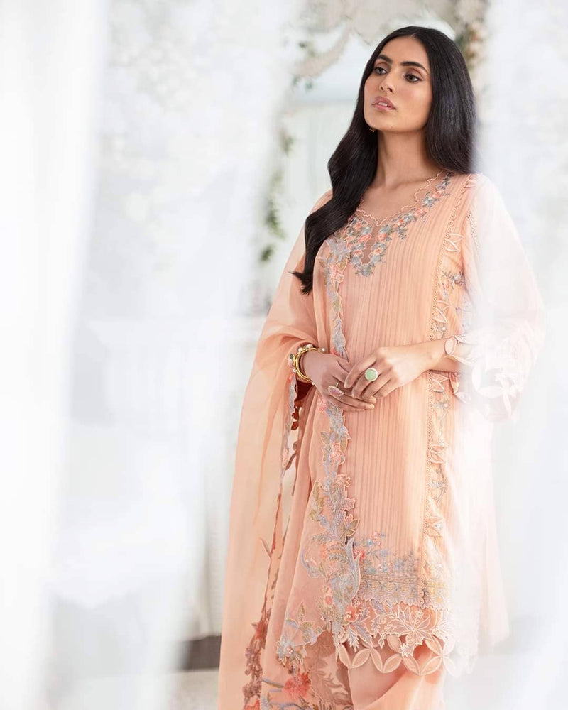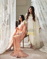 Unfolding a tale of sheer elegance and grace incorporating hues of peach, corals and denim blue on a printed lawn canvas. To complement the look is an exquisitely embroidered dupatta paired with congo peach pants, making it an exclusive pick for the spring season.