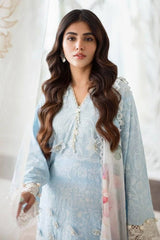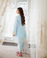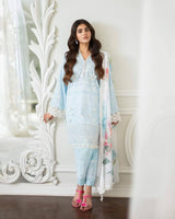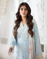 A masterpiece evocative of European wedding style on a sky blue canvas. The alluring cotton pants are complemented with a silk dupatta which is layered with botanical prints that blossom like the gardens of spring.