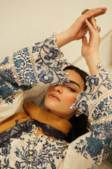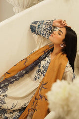 Spring livens with this calming jasmine white lawn shirt, planted with fringed guipure lace and chrysanthemum inspired cobalt blue embroidery. Enhanced with a cotton woven munsell yellow dupatta and cotton pants. A look that will become your season’s favourite.