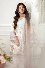 A whimsical affair of floral stories showcased on a lawn fabric. The shades of lavender, camellia pinks, and olives enhances the exclusivity of the shirt with matching cream pants. The splendid mehsori net dupatta further completes this artistic outfit.