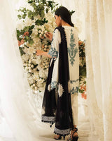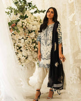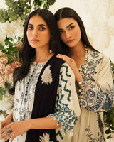 The splendor of spring glory is artistically placed on a printed lawn canvas utilizing pearl and hala blue hues. This chic silhouette is completed with a dark cobalt blue silver chiffon dupatta and alluring pearl pants, making it a true embodiment of sophistication for the upcoming season.