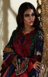A pine green, beige and navy blue cotton satin shirt is digitally printed with Chinese and damask motifs and deep red Moroccan inspired embroidery. Paired with beige cotton pants and a deep blue, oxidized gold and maroon woolen shawl with a damask and floral print.