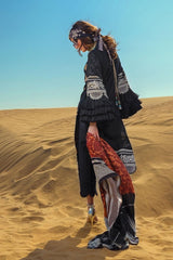 A set floral embroidered shirt on black slub with dyed sleeves and back and printed floral borders. Comes with a woven geometric design jacquard shawl  and a dyed trouser.