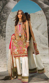 A khaki slub shirt with bold floral embroidery in shades of tangerine, pink and red and vibrant printed borders. Paired with a lavish cream and olive pallu printed woven shawl with a bright pink center.