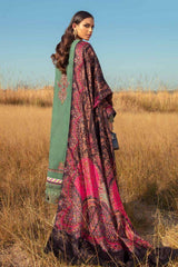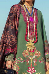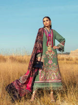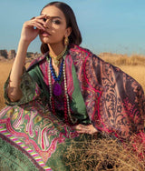 An army green canvas with pop pink, khaki green, cream, burnt orange and lime green rests over a resham embroidered slub shirt inspired by Kashmiri paisleys. The lawn neckline is embroidered in an array of bright pop pinks, lavenders and burnt oranges. Paired with army green cotton tensil pants and a woven dupatta that is digitally printed in pop pink, lavender, black, moss green, black. A muted look for the serene and calm winter awakening.