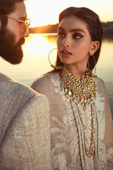 This beige embroidered slub shirt is layered with floral dreams in cream thread embroidery base. The sleeves and back are paste printed in beiges and creams. Complementing the light and subtle look are the beige cotton tensil pants. The woven gold zari shawl in beiges and golds ends with an embroidered resham border over an organza base and is finished with 4 aari embroidered kufls. A muted and classic look.
