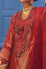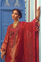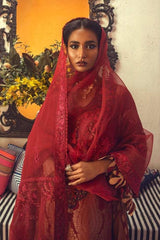 This outfit is a red love affair weaved in gold zari jacquard and a neckline on a contrast black base embroidered in red, blue, and gold resham dhaga. The red color organza dupatta with floral patterns of red and gold resham with embroidered pallus completes the look.