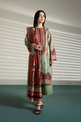 Adorn grace with this three piece unstitched printed ensemble in khaddar imbued in sea green paired with orange hued dupatta.