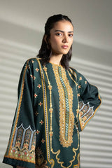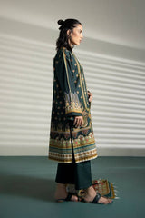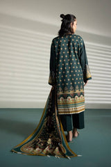 Adorn grace with this three piece unstitched printed ensemble in khaddar imbued in dark green paired with multi hued dupatta.