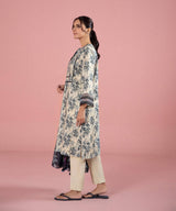 Envelope yourself in a floral fantasy with this grey three-piece lawn ensemble featuring a blue voil dupatta.