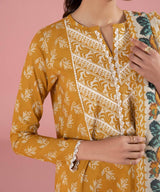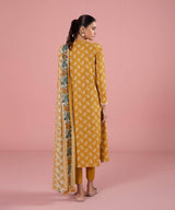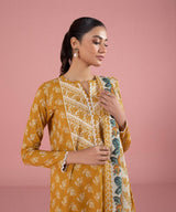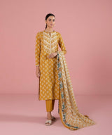 Brighten up your wardrobe with this mustard unstitched two-piece ensemble featuring dainty patterned lawn shirt and a beige voile dupatta.