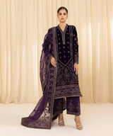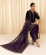 Dazzle this festive season with our three-piece velvet ensemble in bringle featuring a blended organza dupatta and raw silk trousers.