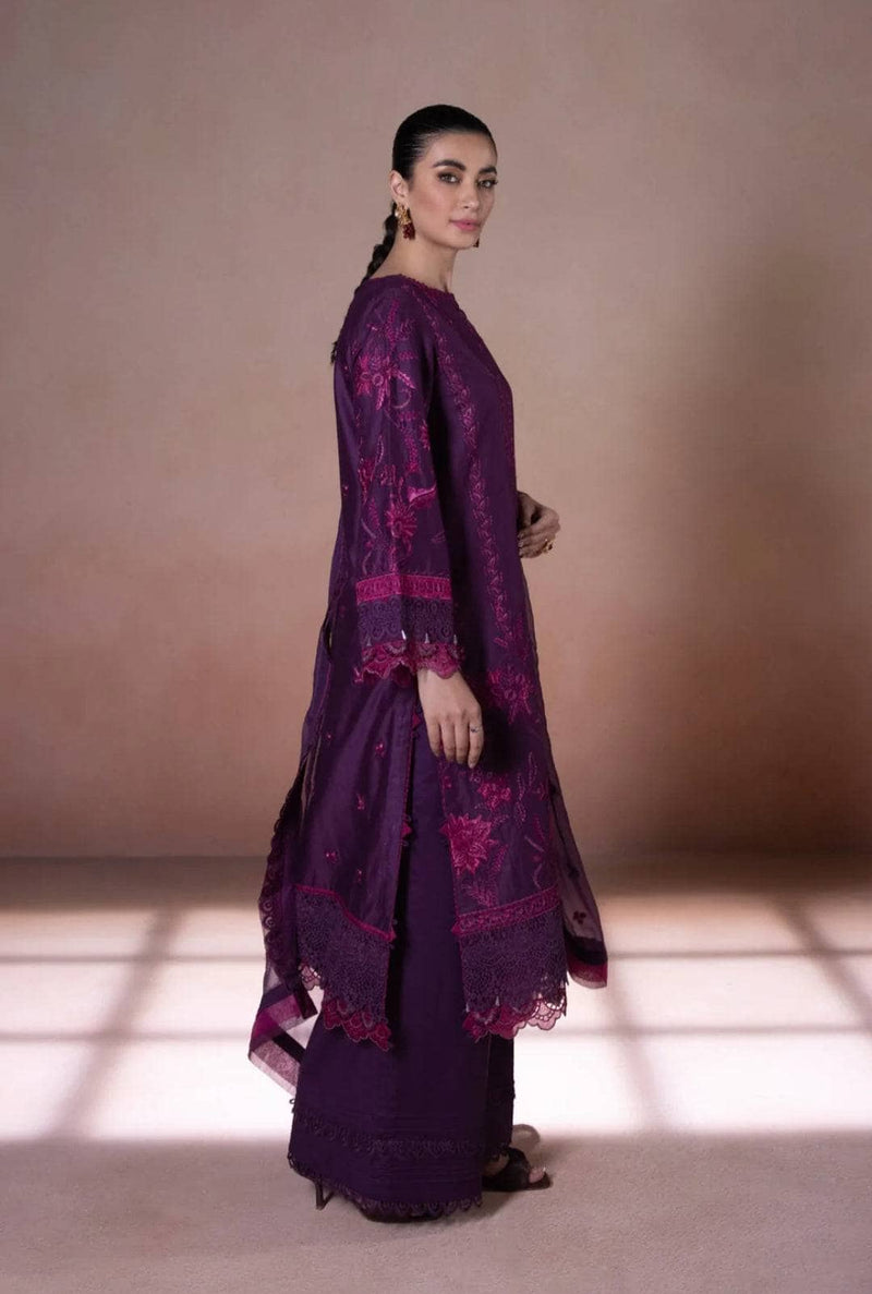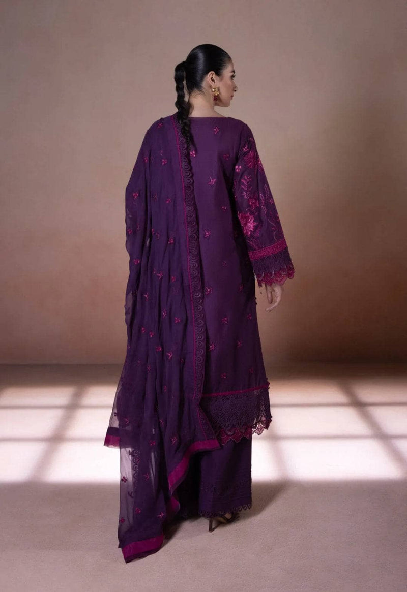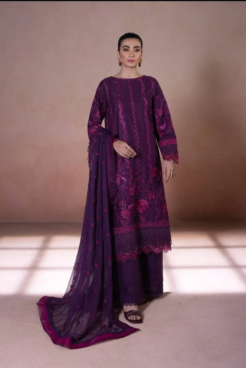 Adorn hues of purple in this embroidered three piece dobby shirt paired with a matching cotton trouser and chiffon dupatta.