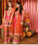““Farahnaz” is a stand-out ensemble fit for royalty. Inspired by the last reigning Queen of Iran, Princess Farah, this outfit is bold and unapologetically vibrant. The fuschia, orange and yellow tones are balanced and modernised by the use of “chunri” prints, indigenous to south asia and very much in trend. This versatile outfit can be styled as a fun, gypsy-style lehenga with a shorter hemline shirt or even a “choli”! Alternatively, it becomes a perfect long-style shirt with a “sharara” in a more traditional Pakistani style. It’s statement neckline is encrusted with layers and layers of sequins which are technically used in a way to give a very heavily embellished look and the shirt features composed botanical embroideries in “resham” and “tilla” with sequinned over-layering. The lehenga style comes to life when paired with an embroidered belt! You just can not afford to miss out on this one. Pre-booking starts on the 10th of December at 9pm so gear up ladies!