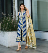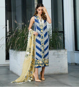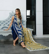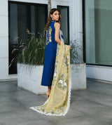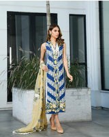 Thrilled to present Pleated Perfection! The lace embroidered front is broken up with organza pleats and finished with floral embroideries in the most beautiful shades of yellow. The yellow woven net dupatta contrasts gorgeously with the cobalt outfit, creating a look that is both wearable and memorable.