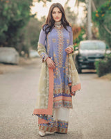 Like a secret garden, delicate flora stretch out on the mesmerising lavender canvas with hints of ivory and peach peaking out in perfect harmony in ‘Zenel’. Glistening mirrors are delicately sewn onto the silk thread creating a breathtaking composition. An elaborate dupatta is crafted from soft, tea organza with detailed embroidered schiffly framed by borders that feature a detailed garland of florets swirling on all sides. A beautifully feminine design that’s perfect for eid festivities.
