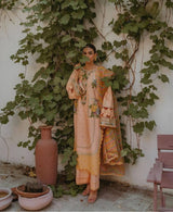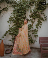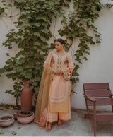 Introducing "Rani" from MNR Festive Lawn'24 a delightful ensemble in pretty peach, perfect for summer. The front panel features delicate embroidery dotting the neckline and hems, with rose bunches in yellow and blue placed across the front. A decorative eyelet panel adorns the hemline, adding to its charm. The embroidery, done in green, yellow, and blue, creates a contrasting light feel. Crafted with care, the ensemble includes one embroidered front canter panel, two side panels, and sleeves. Satin borders adorn the front and sleeves, while the back features a printed design. The ensemble is completed with a printed organza dupatta and an embroidered border. It is paired with dyed cotton trousers for a breezy summer look.