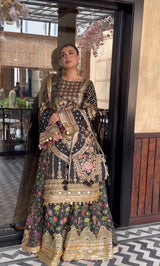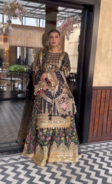Step into the world of 'Koyal,' an ensemble as captivating as a melodious bird's song, in a stunning kohl-hued color. The silk embroidered shirt is a masterpiece of craftsmanship, featuring hand-embellished ada-work, delicate sequin work, and enchanting card mirror work, elegantly contrasted by satin silk borders.The ensemble is beautifully completed with a silk gharara boasting a floral print and a satin silk embroidered border, adding a touch of whimsical elegance. The printed and embroidered dupatta, with its four-sided satin embroidered border, is the final note in this symphony of style. 'Koyal' is a celebration of grace and artistry, the perfect choice for brides who seek timeless beauty with a touch of the extraordinary.