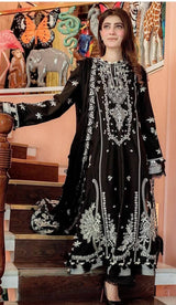 Delicately composed floral embroideries are rendered in ivory silk thread on an enigmatic midnight canvas in 'Yamina.' Layered over an ebony trouser and paired with an all round embroidered dupatta, this smoldering design is a classically chic look for summer evening affairs.