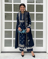 A sumptuous deep navy serves as the canvas for ‘Jinani’. With delicate kantha style embroideries in ivory and gold and a quirky dupatta with embroidered leaves this design makes a sophisticated yet fashion forward statement.