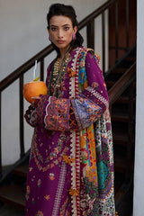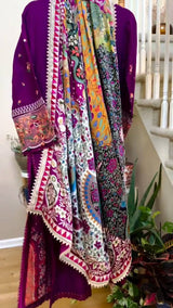 Delicate florals bloom on the deep Mulberry canvas of ‘Aalia’. The shirt features a centre panel adorned with floral tussie-mussie framed with a swirling festoon of bright florals. The shirt is further accentuated with contrasting lilac border layered with flora and fauna and a schiffli border on the slit to lend contrast to the layout. Paired with a sumptuous pure medium silk dupatta, this striking design creates for an ethereally feminine ensemble thats forever wearable.